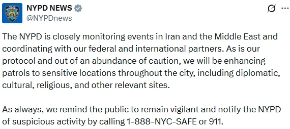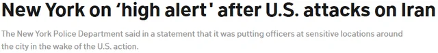 纽约市警察局也在社交媒体上发布声明称,正在密切关注局势发展,并且已在敏感地点部署警力。