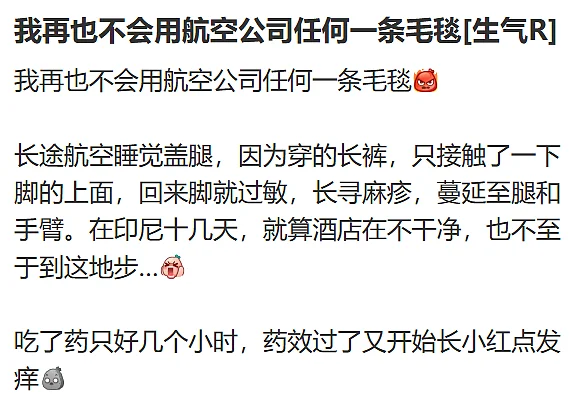 最近,有网友在社交媒体上分享了她的遭遇:仅仅因为在飞行途中使用了机上毛毯,不久后便出现了严重的过敏反应,长出荨麻疹,久治不愈。
