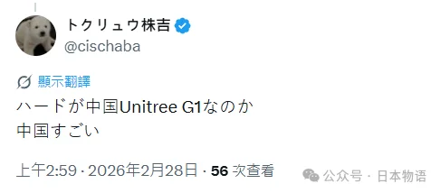 这台机器人的“身体”,来自中国宇树科技的人形机器人 G1,他认为软件是日本开发,但硬件是中国制造。