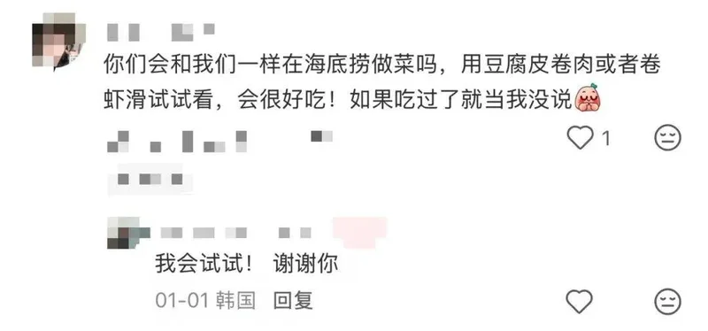 而在一些中韩民间交流中,还出现了“秘方社交”,中国网友在线教学韩国人调酱料和各种邪修吃法,毕竟海底捞这块,中国的老吃家们早已在此开宗立派,修炼出了各种绝不踩雷的硬核吃法。
