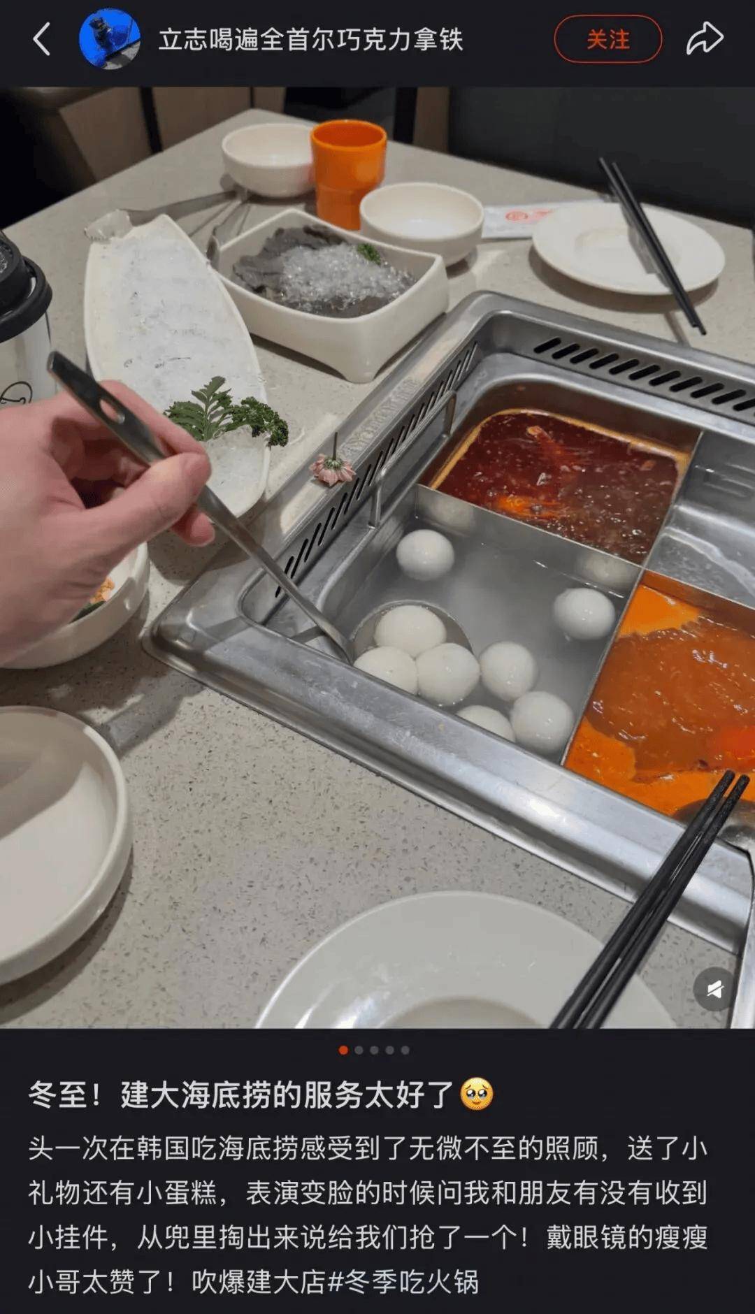 有人说,韩国海底捞就是一次精准的富养,“在韩国吃饭,分量这件事严谨得近乎刻板,定量盛放的部队锅、精准到克的烤肉。而海底捞恰恰相反,四宫格锅底、三十多种调料在蘸料台排开,对习惯饭馆只给几碟腌菜的韩国人来说,这种选择自由是一种绝对另类的体验。”