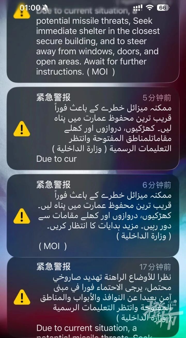 有被困迪拜的网友说,“半夜惊醒,炸了3次,不知道是空中拦截还是什么掉落,手机警报还响个不停。”
