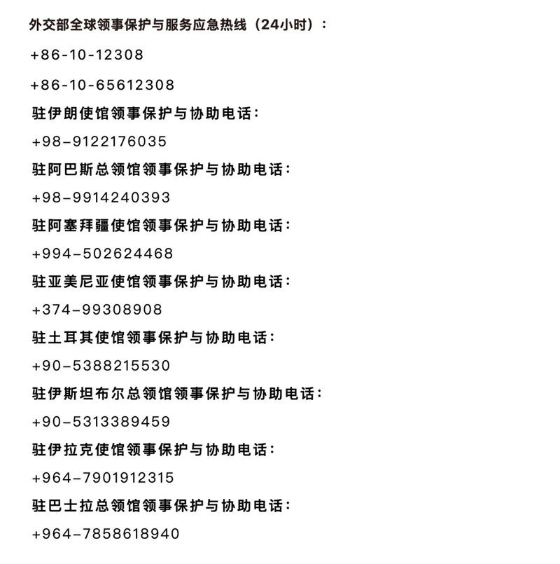 当前,伊朗和周边地区安全形势持续恶化,局势不可控风险高企。中国外交部和驻伊朗使领馆已提醒在伊中国公民尽快通过陆路边境口岸离境。
