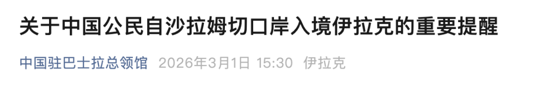 中国驻巴士拉总领馆3月1日发布关于中国公民自沙拉姆切口岸入境伊拉克的重要提醒。