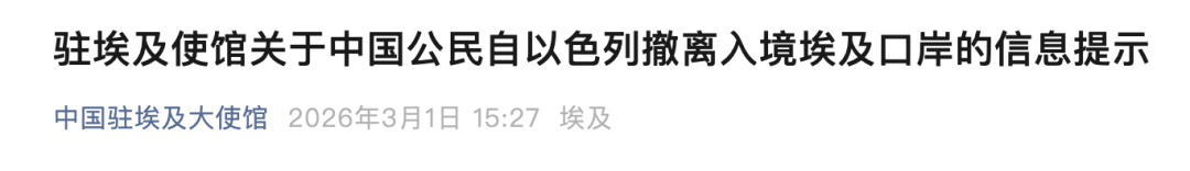 3月1日,中国驻埃及大使馆发文称,为协助在以色列中国公民转移撤离,驻埃及使馆已派出工作组赴埃及塔巴口岸驻守办公。现发布最新掌握的边境口岸信息如下: