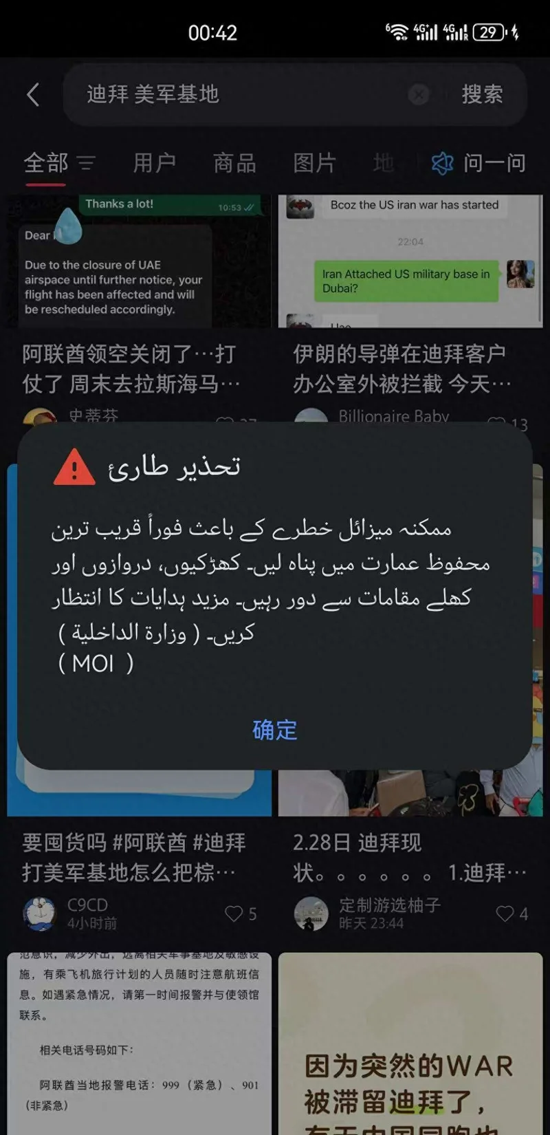 在沙迦机场的14小时:飞机在空中掉头,滞留时“鹰也插翅难飞”当地时间3月1日凌晨快1点,从机场回到迪拜家中,建筑师门门刷着手机缓解心情。屏幕上显示着她刚刚搜索的关键词——“迪拜 美军基地”。突然,一条紧急警报弹了出来:“鉴于当前局势,可能存在导弹威胁,请立即在安全的建筑物内避难,远离窗户、门和露天区域,并等待官方指示(内政部)。”