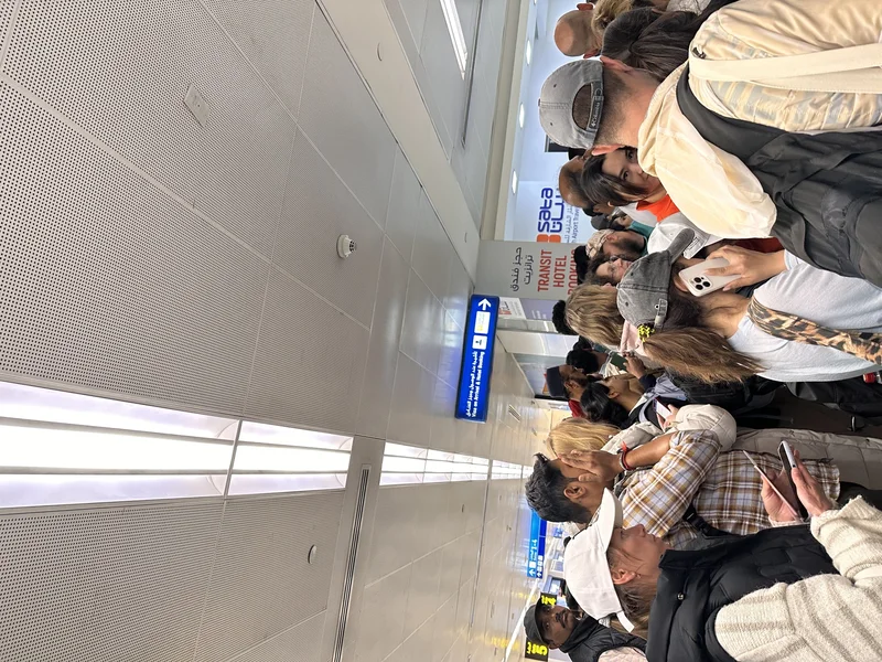 候机厅里,情绪开始发酵。带插头的座位全被人占了,还有人跟工作人员吵架。门门曾向一位穿着白袍的当地官员询问,对方表示有阿联酋ID(身份)可以走,没有就不能离开。门门反复沟通,对方犹豫了一下说:“那好吧”——仿佛这事可以商量。从候机厅走到到达厅,门门以为可以走了,结果到达厅里挤满了人,全是被困的旅客。大家围着工作人员理论,对方还是那句话:等移民局介入。