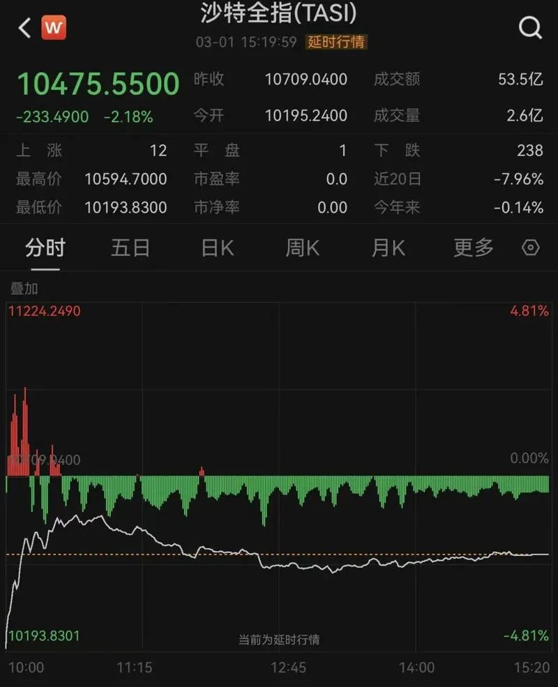 股市方面,3月1日早盘,沙特阿拉伯股市指数(TASI)下跌4.8%,截至发稿,跌幅收窄至2.18%。埃及主要股指早盘下跌5.44%。