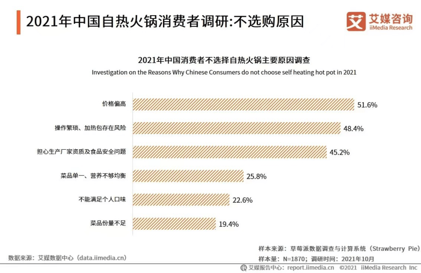 在艾媒咨询2021年的调研中,“价格偏高”是消费者不选择自热火锅的最主要原因。