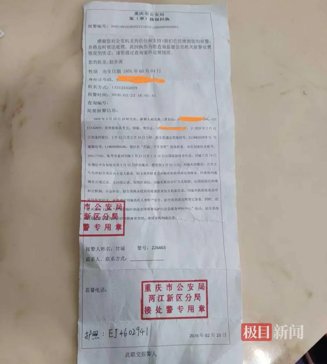 据重庆市公安局两江新区分局2月23日出具的案(事)接报回执显示,刘瑜失联前联系没有任何异常情况,赵女士未收到遇害求助及勒索信息,不能确定刘瑜的人身财产安全。经查询,刘瑜确有出境记录,无回国记录。赵女士拨打了12308外交部全球领事保护与应急服务呼叫中心电话,按照要求提供材料给驻阿联酋使领馆,继续寻找刘瑜。