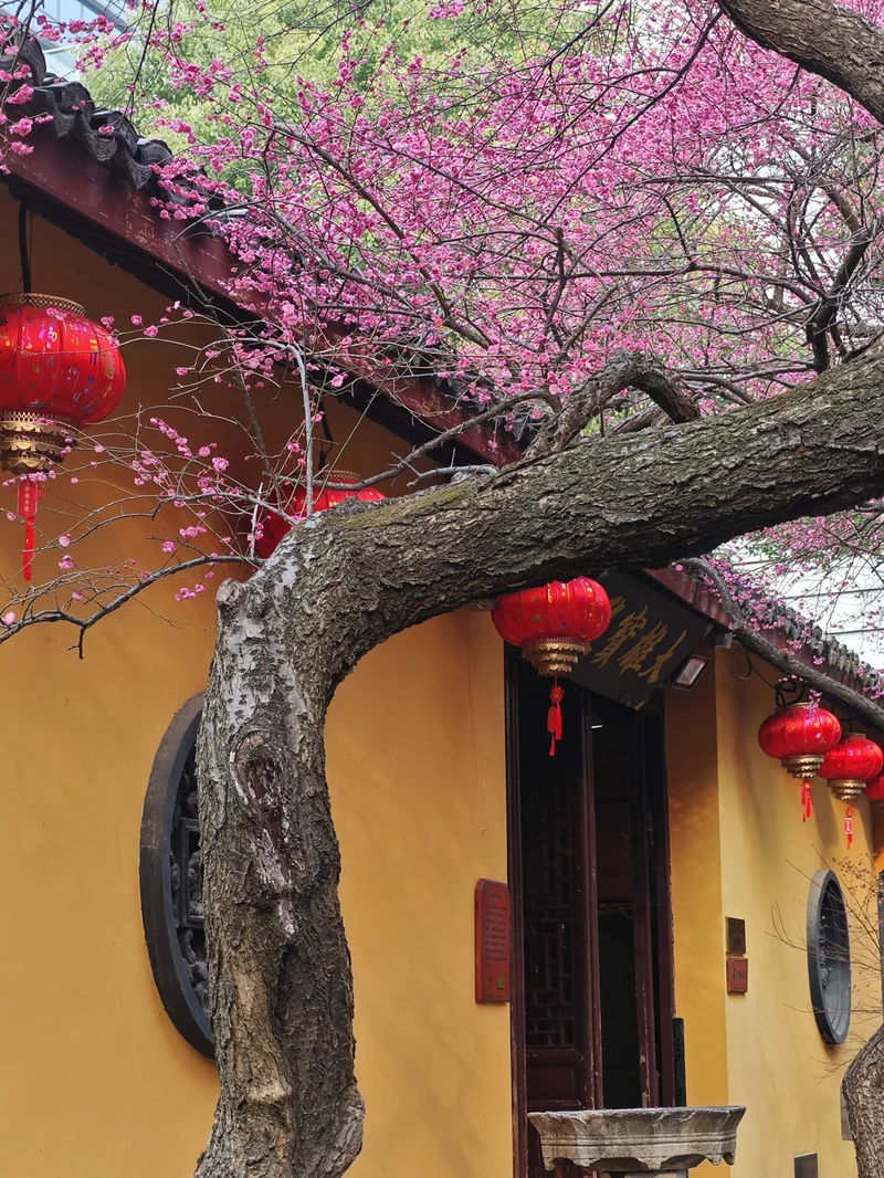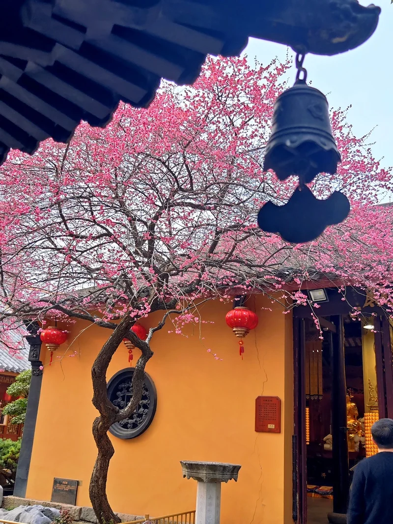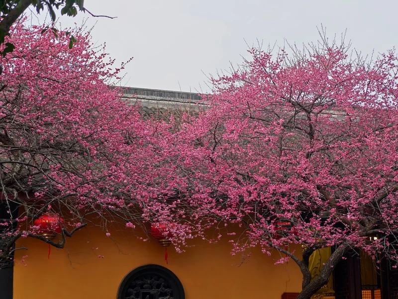 湖州铁佛寺以大雄宝殿前两株百年“六瓣红梅”闻名,是江南地区春季赏梅绝佳打卡地。每年2月下旬至3月上旬,古寺黄墙黛瓦与绚烂红梅交相辉映,禅意浓郁,极具艺术色彩。这两株百年红梅分别状若游龙和凤冠,被誉为江南梅花“顶流”。