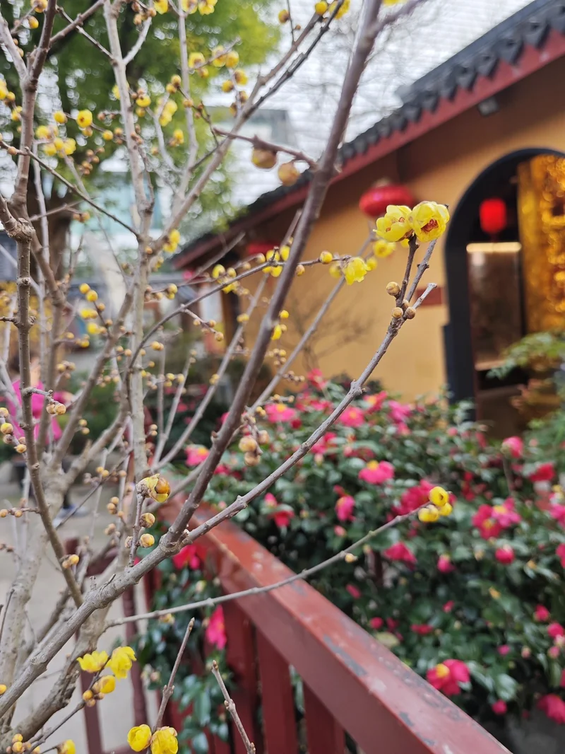 罕见六瓣红梅: 区别于普通五瓣梅花,铁佛寺的红梅花瓣为六瓣,极为少见古刹氛围: 红梅与古寺的黄墙、青瓦相互映衬,画面充满了中式优雅与禅意。
