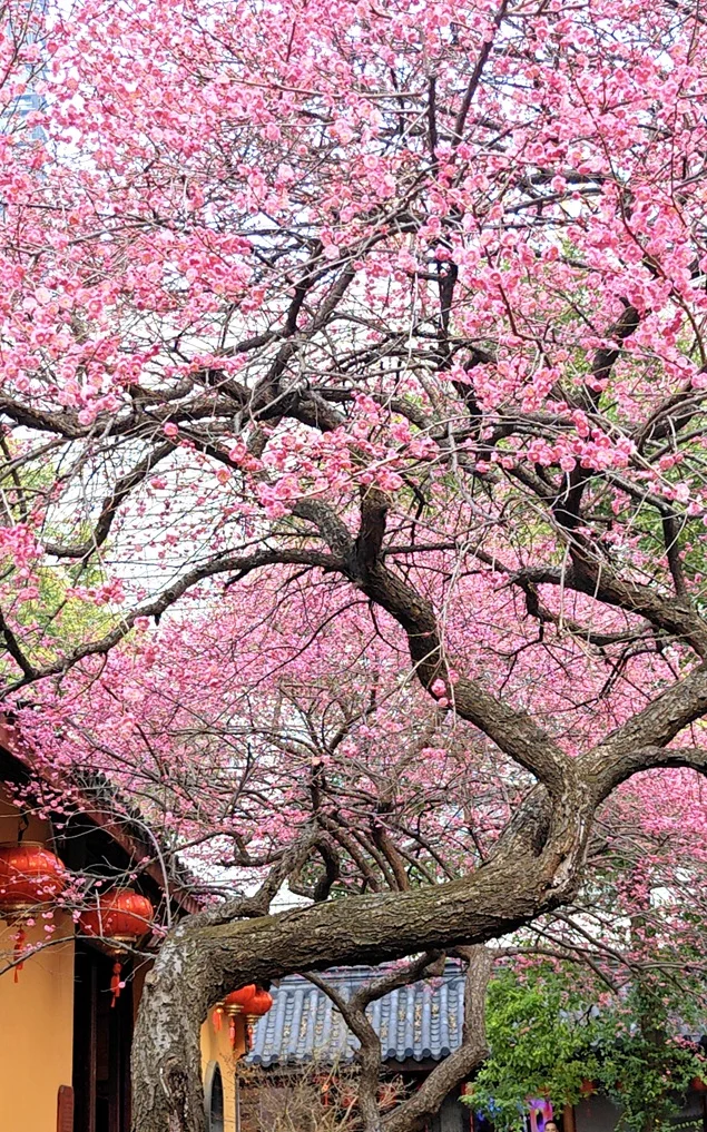 浙江湖州铁佛寺以大雄宝殿前两株百年“六瓣红梅”闻名(寻常梅花五瓣)。古寺黄墙黛瓦与绚烂红梅交相辉映,禅意浓郁。这两株百年红梅分别状若游龙和凤冠,被誉为江南梅花“顶流”。