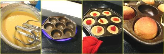 网购了一个墨鱼蛋的铸铁模,本来是烤肉丸的,但转念烤起小蛋糕,又再想细化一些,加了个新鲜草莓内馅,别有一番风味。