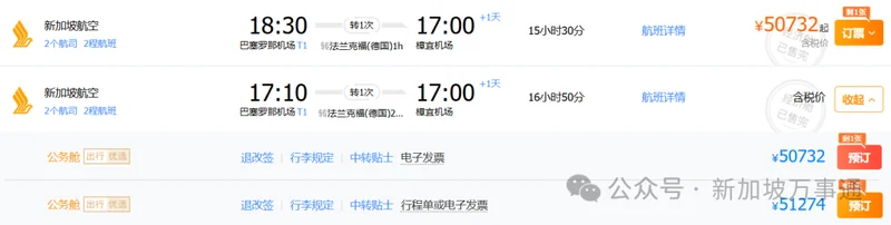 而从巴塞罗那飞新加坡的单程机票则要50732人民币(9380新元)。