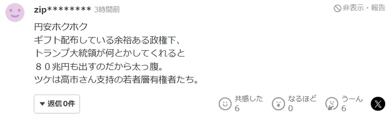 日元贬值让某些人赚得心满意足。这个政权还有余力到处撒钱发福利,还指望特朗普总统能想办法解决问题,甚至豪气地拿出80万亿日元。而最终为此买单的,将是支持高市的年轻选民群体。