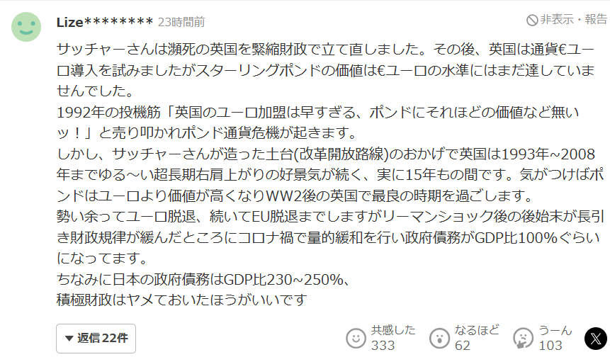 撒切尔夫人通过紧缩财政,使濒临崩溃的英国重新振作起来。此后,英国曾尝试引入欧元这一货币,但当时英镑的价值尚未达到欧元的水平。1992年,投机资本认为“英国加入欧元还为时过早,英镑根本没有那么高的价值!”于是大举抛售英镑,引发了英镑货币危机。然而,得益于撒切尔夫人所奠定的基础(改革开放路线),英国从1993年到2008年经历了一个宽松而长期、持续上升的经济繁荣期,整整持续了15年。不知不觉中,英镑的价值已经超过欧元,英国也迎来了二战后最好的时期。随后,英国在这种势头下脱离了欧元体系,接着又退出了欧盟。但在雷曼危机之后,善后问题长期拖延,财政纪律逐渐松弛,加之新冠疫情期间实施量化宽松政策,使政府债务达到了GDP的约100%。顺便一提,日本政府债务目前已达到GDP的230%~250%。在这种背景下,继续搞“积极财政”恐怕真的不是什么好主意。