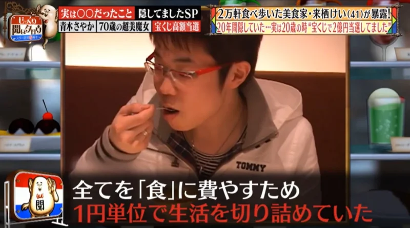 电视台曾跟拍过他的一天:正午西餐7道菜,下午茶是另一家名店的10道菜套餐,傍晚转战串烧店,深夜还需两碗拉面收尾。