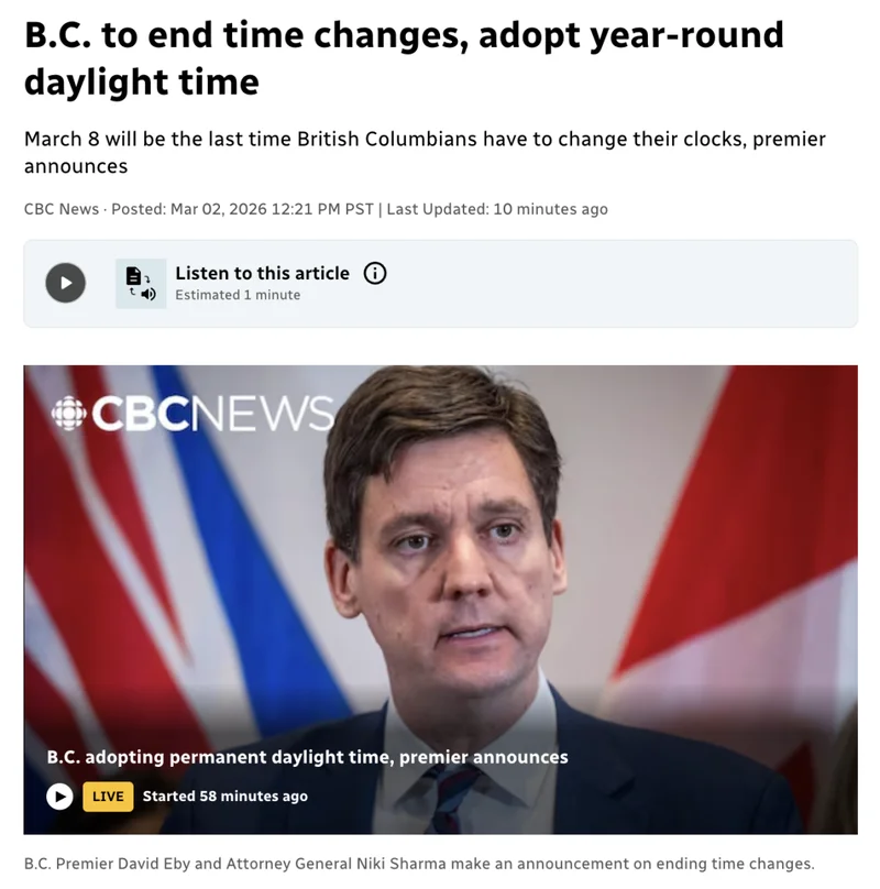 据 CBC 报道,BC 省政府放话:这个周日(3月8日)将是 BC 省人最后一次调钟。