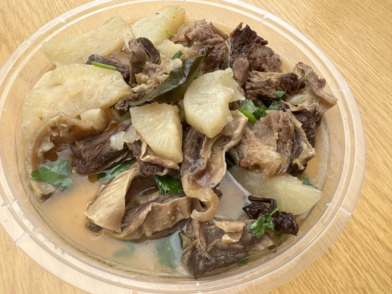 萝卜焖牛腩,猜得应该没跑了。烹调者有经验,放些大蒜,的确增香不少,好配方。