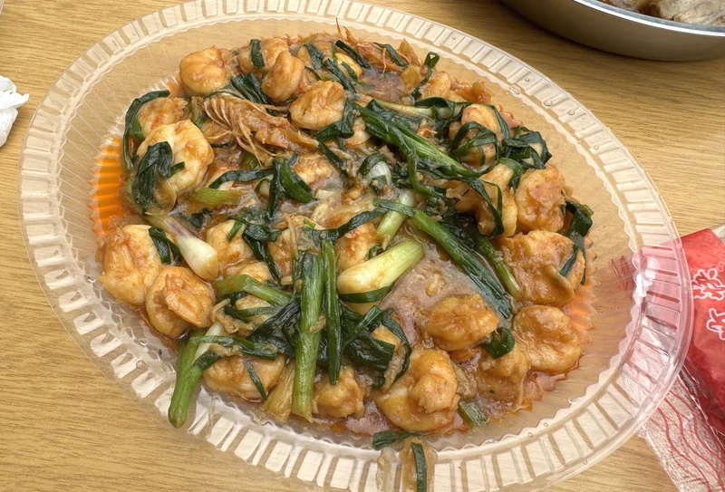估计是蒜仔焖虾仁(湛江人叫大蒜做蒜仔)。