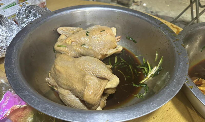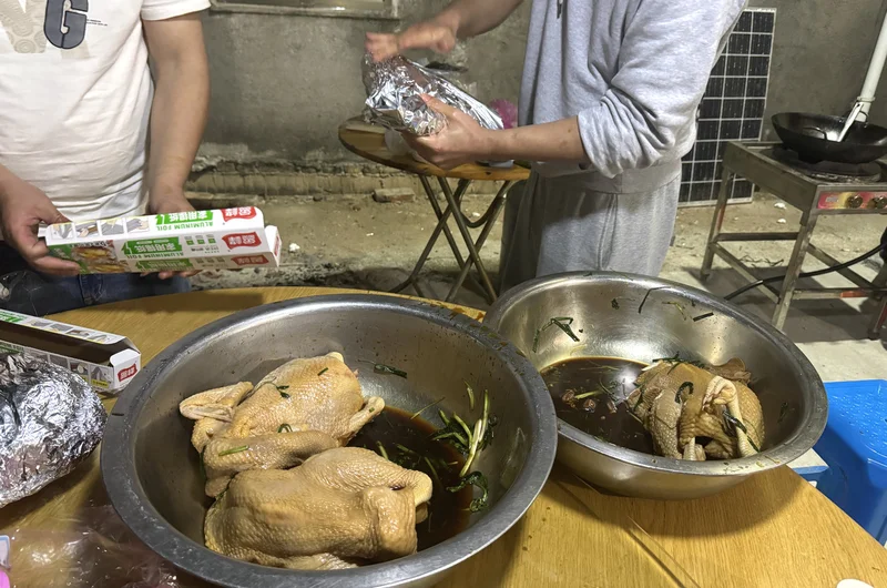 他们用锡纸把鸡包起来再烤,保持原味和汁水。说明一下,如果是烤脆皮鸡,是要搭炉子的,这样烤比较简单些。