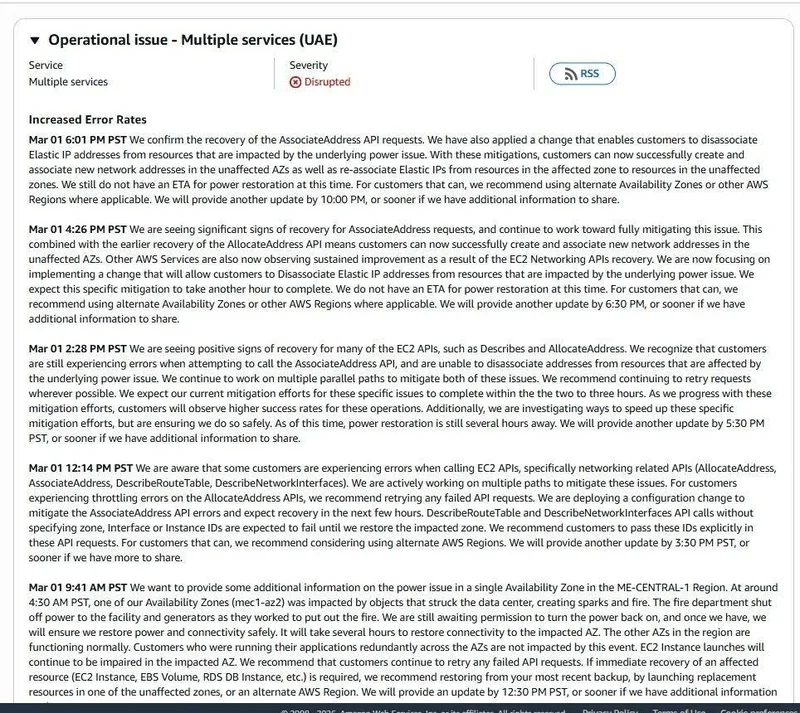 其位于阿联酋(UAE)的核心区域 me-central-1(具体为 mec1-az2 可用区),遭遇了物理打击。