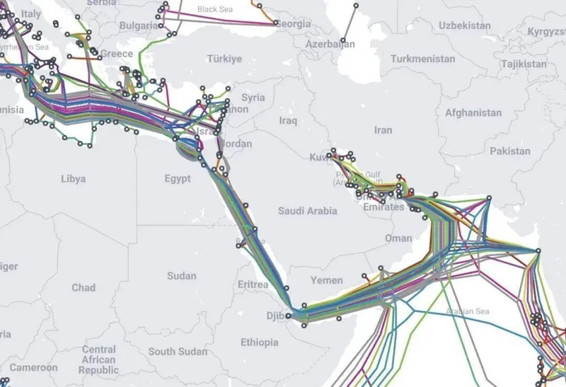 连接欧洲(EMA)和亚洲(APAC)的数条主干光缆(如 AAE-1, SMW5),几乎都汇聚在红海、曼德海峡和波斯湾这一狭长区域。