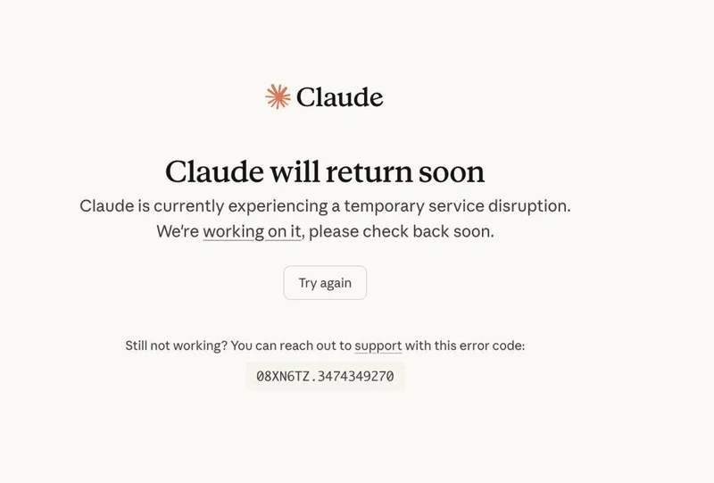 没有旋转的加载圈,没有正在思考的提示,只有冷冰冰的错误代码和一行黑色的 Claude will return soon。