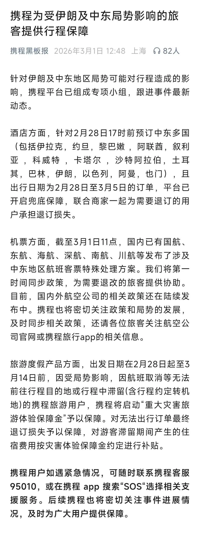 携程在《携程为受伊朗及中东局势影响的旅客提供行程保障》表示,针对伊朗及中东地区局势可能对行程造成的影响,携程平台已组成专项小组,跟进事件最新动态。
