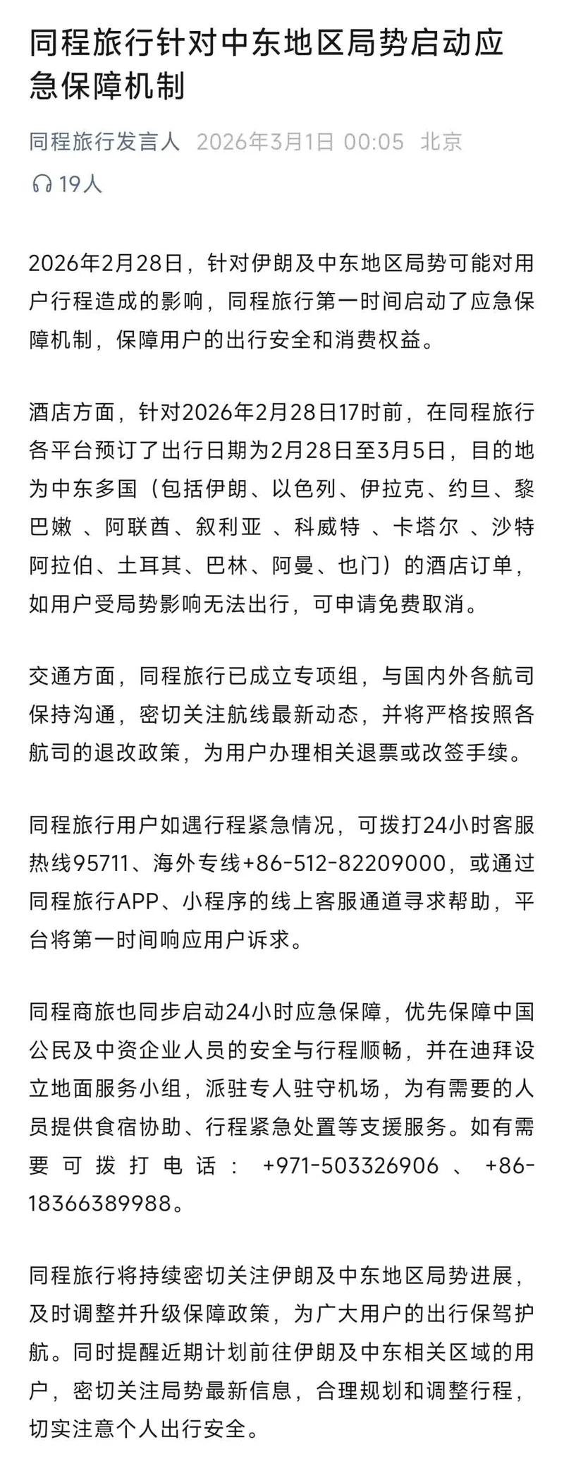 同程旅行官方微信公众号“同程旅行发言人”发布《同程旅行针对中东地区局势启动应急保障机制》称,2026年2月28日,针对伊朗及中东地区局势可能对用户行程造成的影响,同程旅行第一时间启动了应急保障机制,保障用户的出行安全和消费权益。