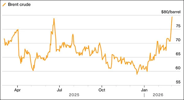 3月2日一早,布伦特原油价格开盘一度上涨近13%,触及每桶82美元,创14个月新高;随后虽自高位略有回落,但仍维持在每桶77美元上方,涨幅约7%。