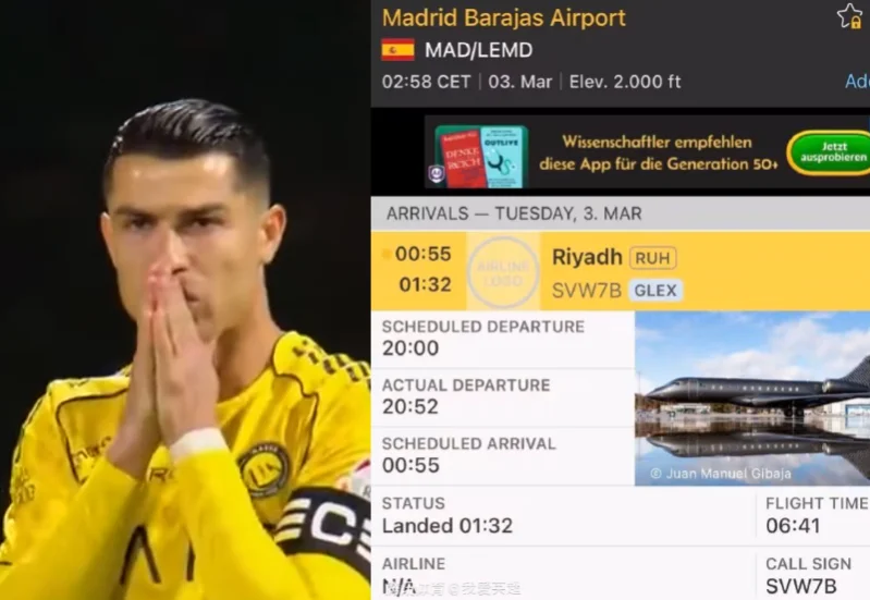 有消息称,41岁的葡萄牙巨星C罗的私人飞机,已于深夜离开沙特。目前尚不确定C罗以及家人是否在飞机上。