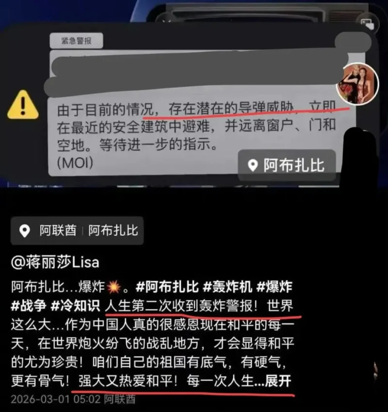 而来自内地的蒋丽莎,手机里两次收到了有轰炸的警报,她后来更多的是抒发自己的爱国情怀。越是在战争时期,越感恩自己有一个强大的祖国,可以保护我们的人民不受战争侵扰,可以享受和平带来的幸福与安宁。