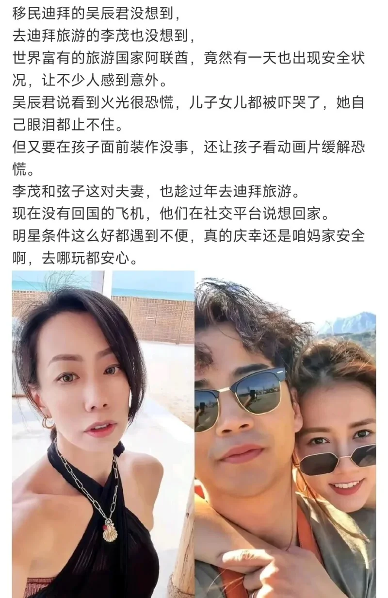 所以,伊朗和以色列之间一开战,首先波及的就是在迪拜机场转机或者正在中东几个国家游玩的明星们。