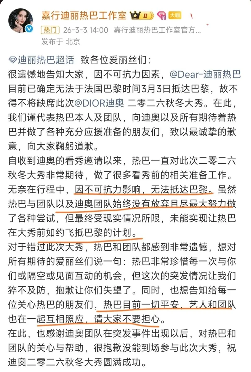 原定要在3月3日赶到巴黎时装周参加奢侈品大牌DIOR大秀的迪丽热巴,被迫在迪拜机场滞留。