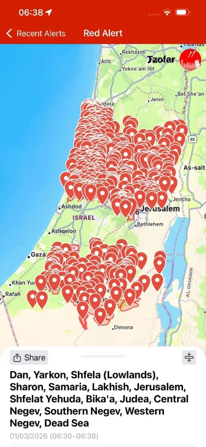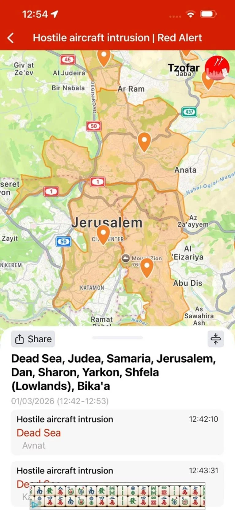 3月1日早上,手机收到导弹警报,红点是可能的打击区域。(图/受访者提供)