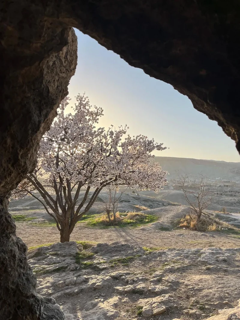 我想起,在阿富汗萨曼甘省艾巴克市(Aybak),一路上只见到茫茫一片土黄色的沙石和枯木。偶然间,我看见路上有一棵樱花树——那是在一户人家房门前一棵很小的树,上面稀疏地开了一些白色的小花。紧接着出现了一小片培育林,一些开了花,一些没有。最后,我们爬上山坡,发现在一个天然的洞穴口,有一棵巨大的樱花树。当时只觉得像被闪电击中了一样:原来这片土地也可以枝繁叶茂,青山绿水,原来峡谷砂石里也能生长出樱花树,原来活着只需要一块地毯。