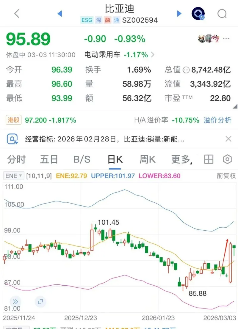 比亚迪A股当天大涨8.24%,收盘时股价是96.79元,成交额超过135亿元。