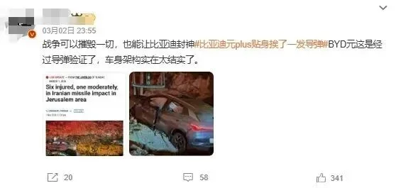 最近,一辆比亚迪在中东用“肉身”接住了一枚导弹的冲击波。车烂了,人活着,互联网炸了。
