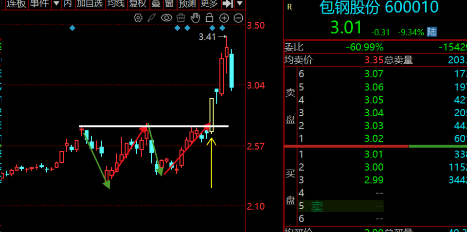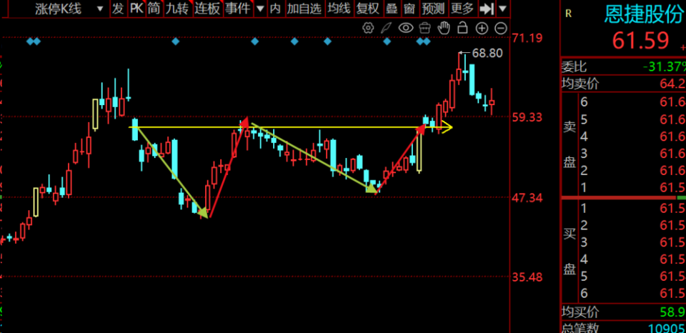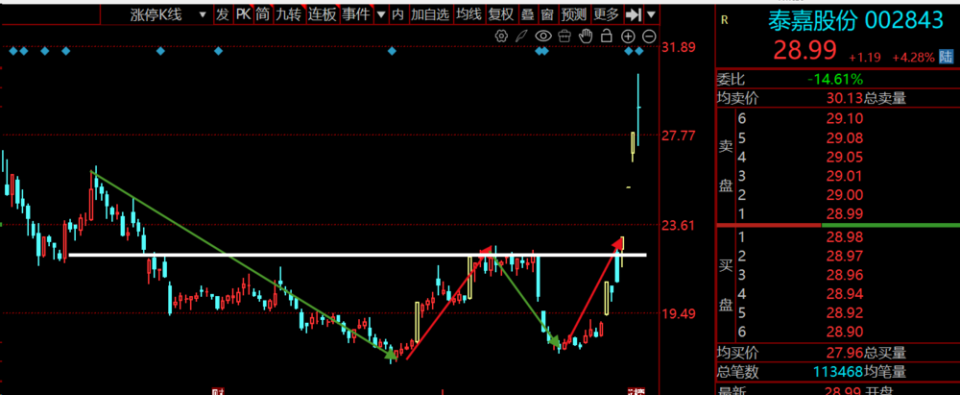 若以形态1的方式突破,那么突破颈线时为第一买点,但这时候买风险比较大,要准备好随时离场;而当股价突破颈线回抽,试探颈线支撑有效,此时的点位为第二买点,这种做法更为稳健,但获利机会相对较小。若以形态2的方式突破,则突破颈线时为买点。