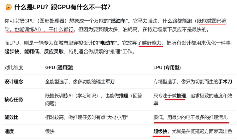 你有一个非常聪明但动作有点慢的朋友(我们叫他GPU),和一个虽然知识面没那么广,但反应超级快、专精某项技能的朋友(我们叫他LPU)。当你想问一个复杂问题时,需要GPU朋友慢慢思考,但如果你只是想快速确认“1+1是不是等于2”,那LPU朋友就能瞬间给你答案。