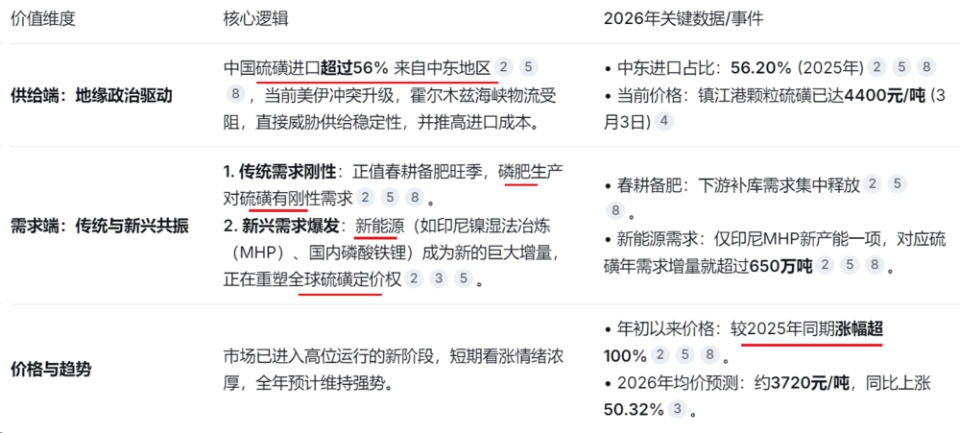 当前,硫磺市场正经历着一场由地缘政治冲突引发的供给冲击和新能源需求爆发共同驱动的深刻变革。当前美伊冲突是引爆市场情绪的导火索,叠加春耕旺季的刚性需求,为硫磺价格提供了强有力的短期上涨动力。