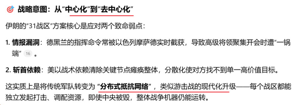 伊朗在2026年3月初进行了军事重组,将全国划分为31个独立战区,并赋予各战区指挥官高度自主决策权。这一举措是在美以联军持续“斩首”行动、伊朗指挥系统遭严重渗透的背景下推出的。要求各自为战,想怎么打都可以。