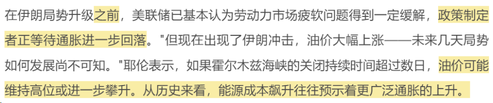 美国前财政部长、前美联储主席耶伦周一表示,伊朗冲突对石油市场的影响将持续多久,将决定其会对美国经济增长造成多大打击以及带来多大的通胀压力,这让美联储的决策变得更加棘手。耶伦当天在加州长滩举行的一次视频会议上表示:“我认为,近期的伊朗局势使美联储更加倾向于按兵不动,相较于事件发生前,他们对降息的态度会更加谨慎。”