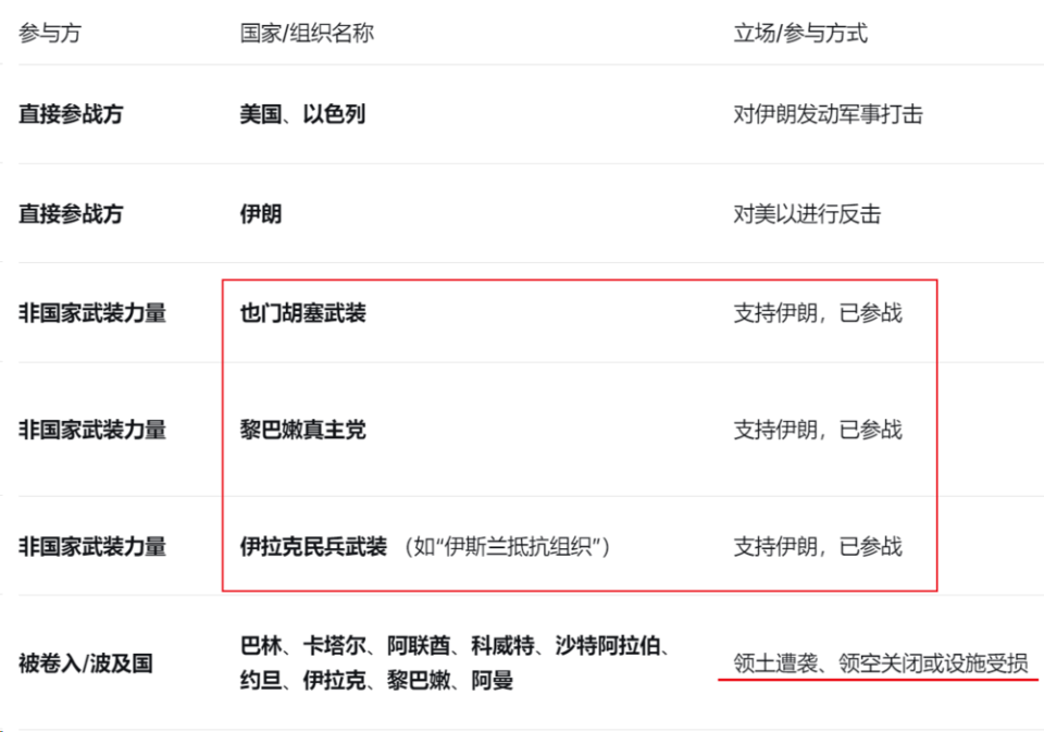 根据最新的公开报道和多方信息,目前被直接卷入或明确表态支持此次中东冲突的国家及非国家武装数量较多,局势复杂。