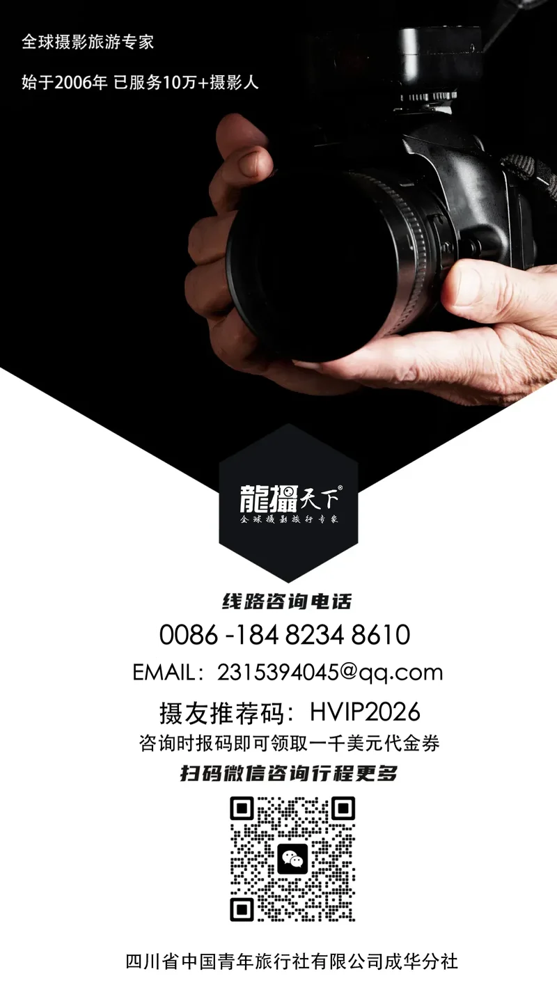 精品小团,名额有限,报名从速。发团时间:2026.5.29-6.16(已成团)价格与详情 请联系下方客服。联系时附上摄友推荐码:HVIP2026 可领取一千美元的旅游代金券。