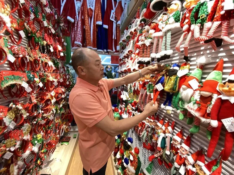 龚永强的店铺,充满了火红的圣诞元素。义乌是全球最大的“圣诞用品”生产基地,从圣诞树、灯饰到服饰、玩具,当地已在多年的发展中建立起一条成熟且可快速响应市场需求的产业链。据新华社2025年12月报道,义乌出口的2万多个品类圣诞用品,占全球市场的近80%。