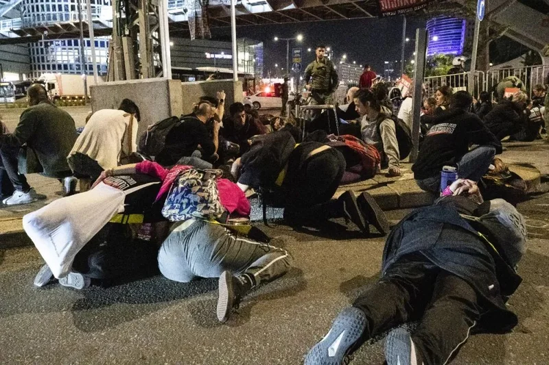 2023年,12月2日,在以色列城市特拉维夫,防空警报响起时,身处室外的人们降低身位避难/新华社记者 陈君清 摄
