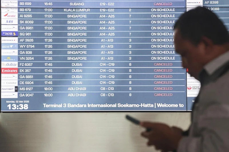 ▲当地时间2026年3月2日,印度尼西亚万丹省坦格朗,苏加诺-哈达国际机场的出发信息板显示航班取消 图据视觉中国